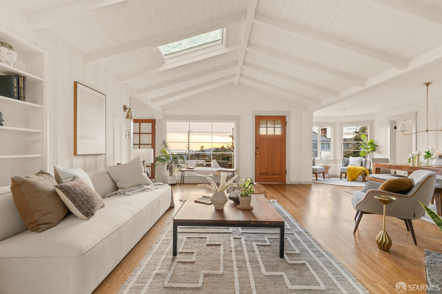 Perched in one of Kensington's most coveted pockets, this enchanting 4-bed, 3-bath residence blends storybook charm with modern flexibility & offers sweeping water & downtown SF views. Vaulted ceilings & skylights crown the open living/dining areas, creating a light-filled setting for everyday living & entertaining. The beautifully remodeled kitchen opens to a side patio ideal for grilling & seamless indoor-outdoor flow. Wrapped in an English cottage-chic aesthetic, the home is surrounded by mature gardens and a thriving wisteria that blankets the faade in spring & summer. A charming yard invites relaxation & play, capped by a detached office at the garden's edge - perfect for focused work or creative pursuits. The entry patio offers one of the best spots to enjoy sunny views framed by cascading wisteria. Upstairs, the spacious primary bedroom enjoys its own deck & panoramic vistas, along with an additional bedroom & office or nursery. The main level features a flexible layout with a bedroom and full bath, plus two bright rooms ideal for bedrooms, offices, or den space. A separate lower-level bedroom and bath with a history of rental income completes the home. Two-car parking & a prime Kensington location close to town make this home an exceptional retreat, workspace, & opportunity.